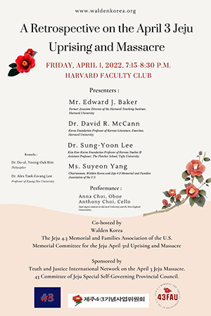 또 하버드대 데이비드 맥켄 교수와 에드워드 베이커 교수, 터프츠대 플레처 스쿨의 이성윤 교수, 재미4·3기념사업회·유족회&월든 코리아 양수연 회장이 주요 연사로 나서 제주4·3항쟁의 비극적 역사를 되새긴다.
