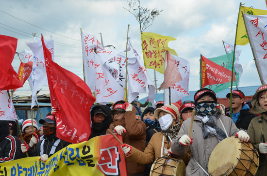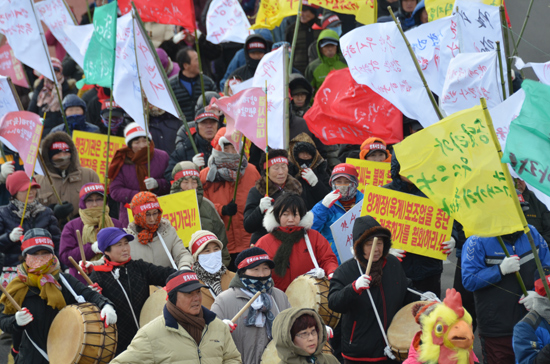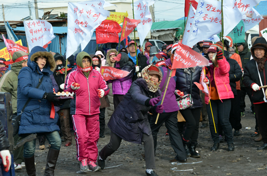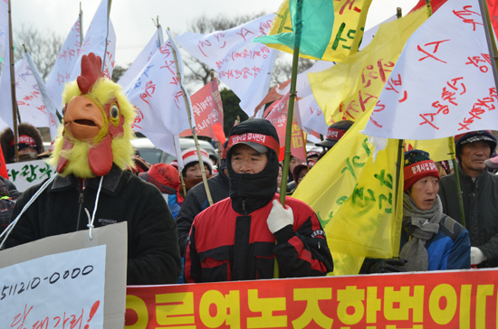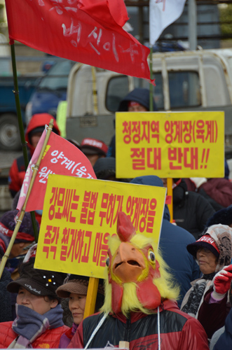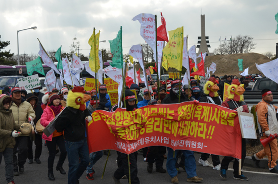집회 참가자들은 집회 말미에 트랙터에 닭이 그려진 판을 설치하고 계란으로 던지는 퍼포먼스를 펼쳐 자신들의 심정을 표출하기도 했다.