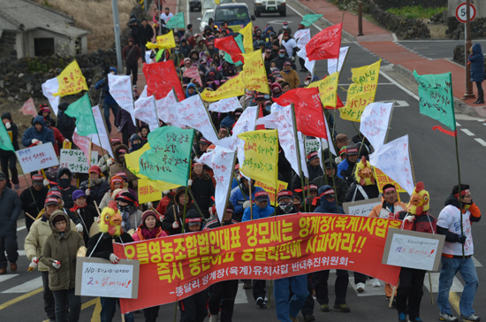 이들은 또 “제주도는 향후 양계사업 시설규모 계획을 전면 공개하고 사업을 중단하라”며 “양계사업을 계속해 진행할 경우 물리적 행동으로 강경하게 대응 할 것”이라고 경고했다. 특히 우근민 제주지사에게 “사업 중단 재재기준을 즉각 마련할 것”을 촉구했다.