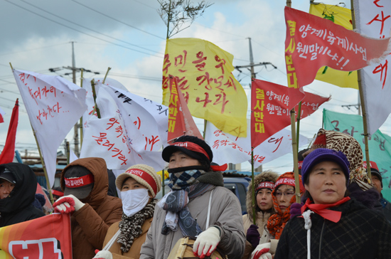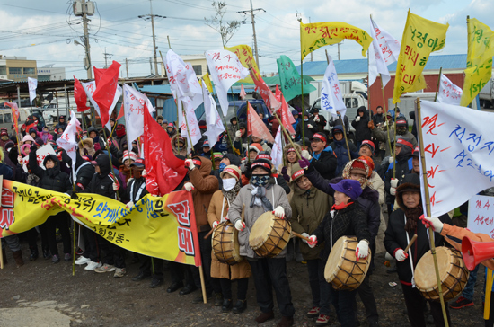25일 오전 10시 제주시 구좌읍 하도리에 위치한 제주해녀박물관 앞. 문제가 되고 있는 마을인 종달리 주민과 구좌읍 12개 마을 이장단협의회, 구좌읍 연합청년회 등 300여명이 모였다. 이들은 머리에 ‘양계사업 결사반대’ 등이 적힌 머리띠를 두르고 손에는 ‘양계장 시설 반대’와 사업자를 규탄하는 각종 깃발과 현수막을 들고 나왔다.