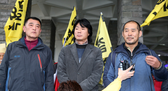 강정마을회 등은 4일 오전 제주도청 현관 앞에서 기자회견을 갖고 법원이 양윤모씨에 대해 법정 구속한 것을 강하게 규탄했다.