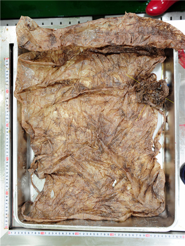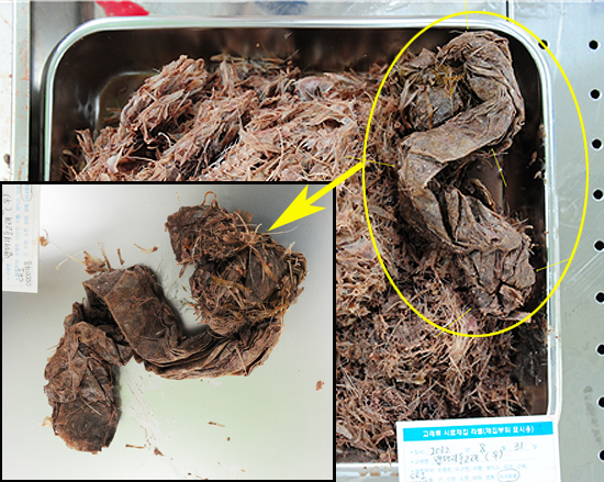 돌고래는 매우 야윈 상태로 근육량과 지방층이 부족했다. 특히 위에서 400㎠ 크기의 비닐과 8cm 가량의 엉킨 끈 뭉치가 발견됐다.