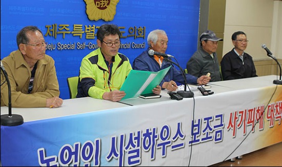 농어민 보조금 사기 피해자 대책위원회는 28일 오후 제주도의회 도민의 방에서 열린 기자회견에서 "시설 보조금 사기행각을 단순 개인적 비리로 몰고 가는 도정의 태도에 분개한다"며 "범 제주도 차원의 '피해자 보상 대책기구'를 설립하라"고 강력히 요구했다.