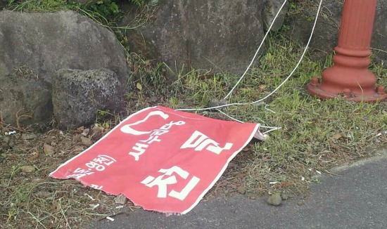 하지만 하루도 채 지나지 않아 현수막의 중앙이 잘린 채 훼손됐다.