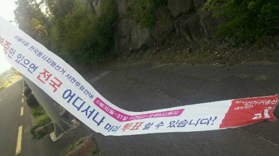 문제의 현수막은 김 예비후보 선거사무소가 지난 3일 서귀포시선거관리위원회의 자문을 받아 '신분증만 있으면 전국어디서나 미리 투표할 수 있습니다'는 문구와 '6월4일 전국동시지방선거 사전투표 5월30~31일', '도의원 예비후보 김천문'이라는 내용을 담아 게시했었다.