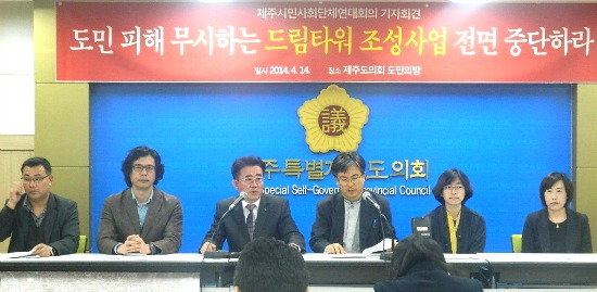 제주시민단체 연대회의는 14일 오전 11시 제주도의회 도민의 방에서 기자회견을 열고 "'드림타워'에 대한 도민사회의 우려, 중단요구를 무시한 채 도정에서 일방적인 행정절차를 강행한다면 향후 제주연대회의 차원에서 행정절차에 대한 면밀한 재검토를 통해 '드림타워' 조성사업의 문제점들을 조목조목 짚어낼 것이다"며 "가능한 모든 방법을 동원해 사업을 중지시키고 이번 사태를 발생시킨 우근민 도지사에게 그 책임을 물을 것이다"고 역설했다.