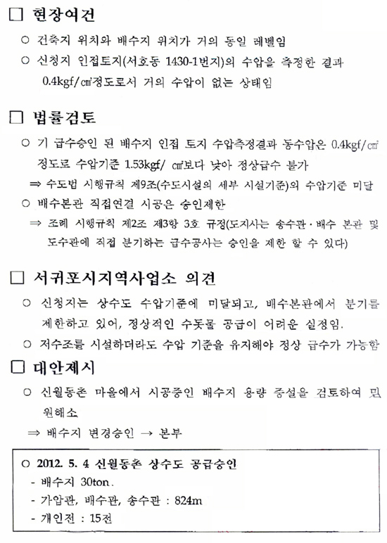 수자원본부는 A씨가 지난해 5월 공동주택 규모를 기존 18세대에서 30세대로 늘리기 위해 옆 부지(1423번지)에 대해서도 개인급수를 신청하자 이번에는 불허를 통보했다.