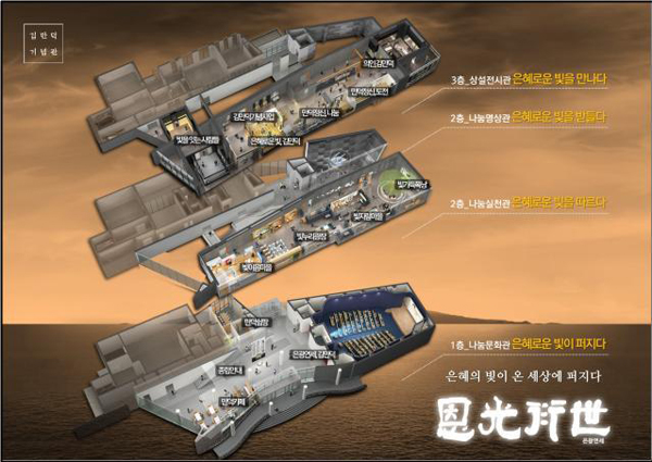 기념관은 ‘은광연세(恩光衍世-은혜의 빛이 온 세상에 퍼지다)’를 전시 주제로 관람 동선을 따라 3층의 상설전시관과 2층의 나눔명상관 및 나눔실천관을 거쳐 1층의 나눔문화관 등 층별 스토리라인을 구성했다.