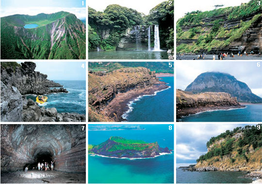 세계지질공원으로 인증된 지질명소는 한라산·성산일출봉·만장굴·서귀포 패류화석층·천지연폭포·지삿개바위(주상절리층)·산방산·용머리 해안·수월봉 등 9곳이다. 모두 신생대 3·4기인 120만~2만5000년 전에 만들어졌는데 제주도 형성사를 규명하는 핵심 지역으로 손꼽힌다. 이 가운데 한라산·성산일출봉·만장굴 등 3곳은 유네스코의 세계자연유산으로, 한라산은 생물권보전지역으로 지정돼 있다. [제이누리=김경미 기자]
