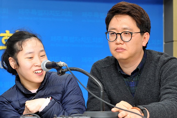 이날 기자회견장에는 당사자인 최씨도 참석했다. 최씨는 어머니와 노형동 사전투표소인 노형초등학교를 찾았다.