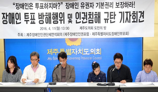 제주장애인인권포럼과 제주도장애인부모회는 11일 오후 제주도의회 도민의 방에서 기자회견을 열고 지난 9일 노형동 사전투표소에서 발생한 장애인 인권침해 사례를 폭로했다.
