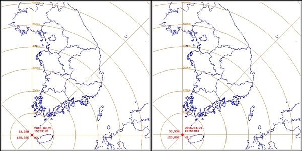 21일 오후 제주 해역에서 2.7 규모의 지진이 두 차례 발생했다.