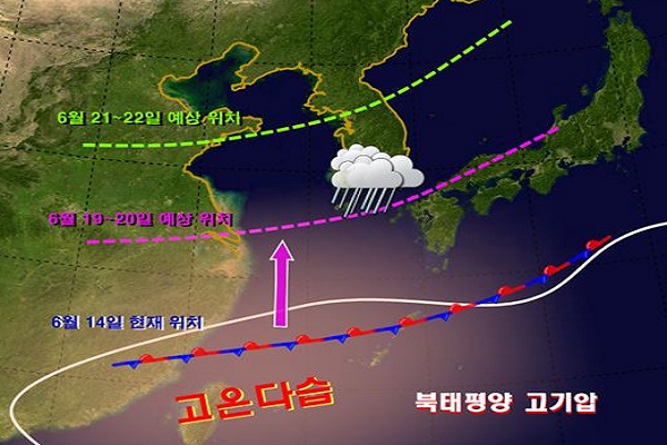 기상청에 따르면 장마전선은 현재 중국해상부근에 위치하고 있다. 북태평양고기압이 18일부터 점차 확장되면서 북상, 19일쯤 제주도에 위치하겠다.