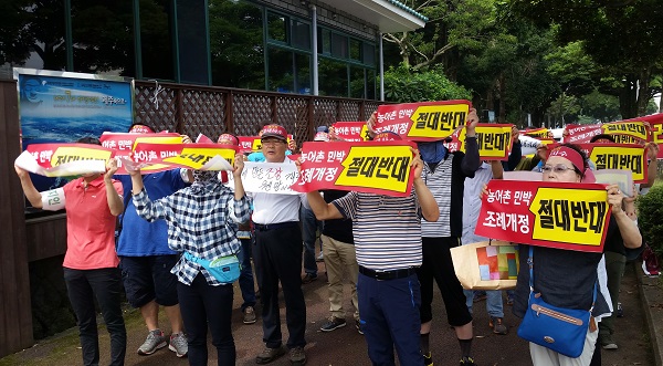 농어촌 민박업자들로 구성된 재산권 수호 비상대책위원회는 18일 도청 정문 앞에서 기자회견을 열고 “조례가 바뀌면 재산 가치는 하루 아침에 절반 이상 폭락할 것”이라고 반발하고 나섰다.