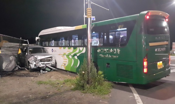 21일 오후 9시25분쯤 서귀포시 안덕면 동광리에서 수학여행단을 태운 전세버스가 도로 경계석과 주차된 차량 등을 들이받았다.