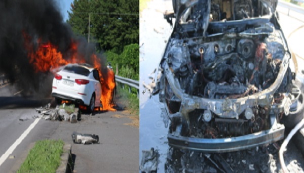 또 이날 오후 3시 20분쯤 서귀포시 성산읍 온평리 일주도로(성산방면)에서 렌터카가 경계석을 들이 받아 불이 났다.