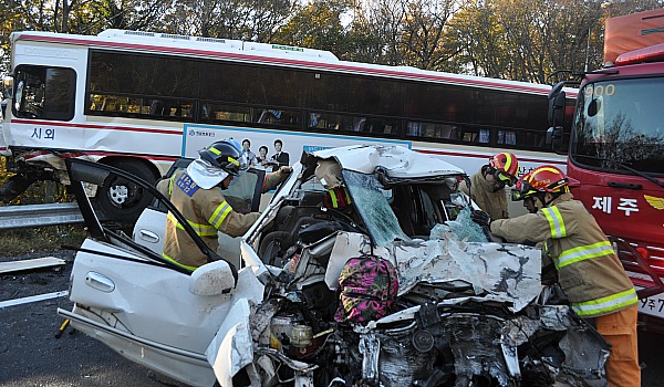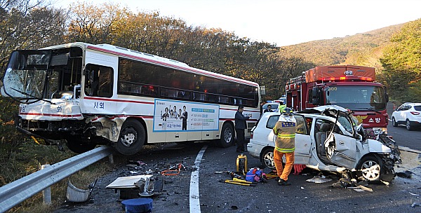 이 사고로 승용차 운전자 한모(67)씨와 동승자 김모(55·여)씨, 노모(55·여)씨 등 3명이 숨지고 또 다른 동승자 2명과 버스 승객 등 12명이 중경상을 입는 등 모두 15명의 사상자가 발생했다.