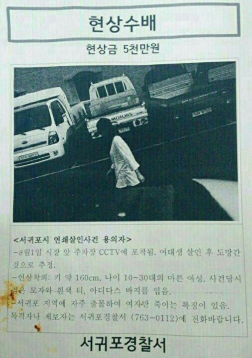 제주에서 뜬금 없는 연쇄살인범 수배 전단지가 퍼지고 있다. 경찰이 수사에 나서 알고 보니 여고생이 벌인 해프닝이었다.