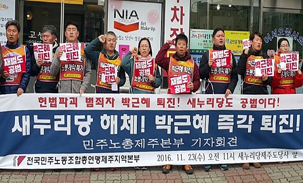 민노총 제주는 23일 오전 제주시 도남동 새누리당 제주도당 앞에서 기자회견을 열고 “국정농단 사태를 방임한 새누리당은 해체를 넘어 역사의 뒤안길로 사라져야 된다”며 이같이 말했다.