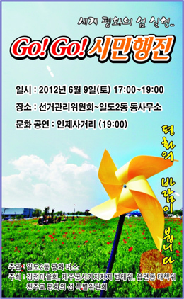 일도2동 평화버스가 주관하고 강정마을회, 제주군사기지저지 범대위, 읍면동대책위, 천주교 평화의 섬 특별위원회가 주최하는 ‘평화의 섬 실현! GO! GO! 시민행진!’이 오는 9일 오후 5시부터 일도2동 일대에서 진행된다.