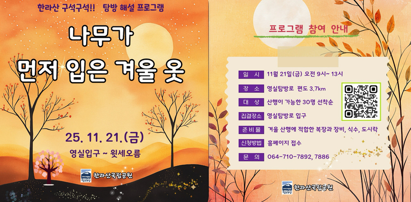 고종석 제주도 세계유산본부장은 “한라산 영실은 가을, 겨울 풍광이 빼어나 많은 이들이 찾는 곳”이라며 “이번 프로그램을 통해 겨울나무의 생명 순환과 자연의 지혜를 느끼는 시간이 되길 바란다”고 말했다.