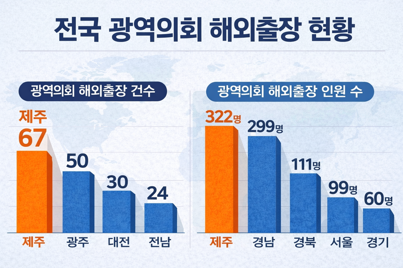 전국 광역의회 의원들의 해외출장 실태를 분석한 결과 제주도의회가 출장 횟수와 인원 모두에서 전국 1위를 기록한 것으로 나타났다.