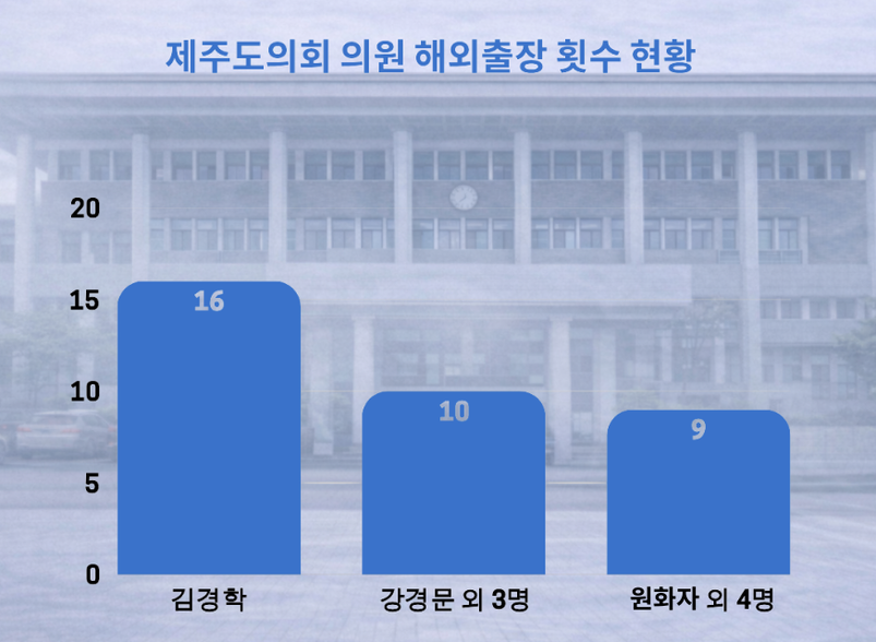 제주도의회 내부 순위에서도 김경학 의원이 16회로 가장 많았고, 강경문·강충룡·김대진·임정은 의원이 각각 10회, 강철남·오승식·원화자·이정엽·하성용 의원이 각각 9회로 뒤를 이었다. 특히 7회 이상 해외출장을 다녀온 제주도의원은 전체 44명 가운데 30명에 달해 반복 출장 사례가 적지 않은 것으로 나타났다.