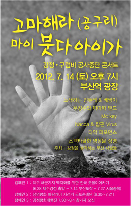한편 이날 콘서트 시작 전인 오후 3시부터 5시까지 부산시 중앙동 또따또가에서 지구인장터 ‘강정평화벼룩시장’이 열린다.