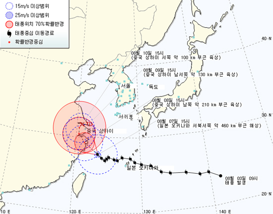 태풍은 8일 오후 중국 상하이 남쪽에 상륙한 뒤 이틀 이상 육상에 머물면서 세력이 크게 약화될 것으로 예상되고 있다.