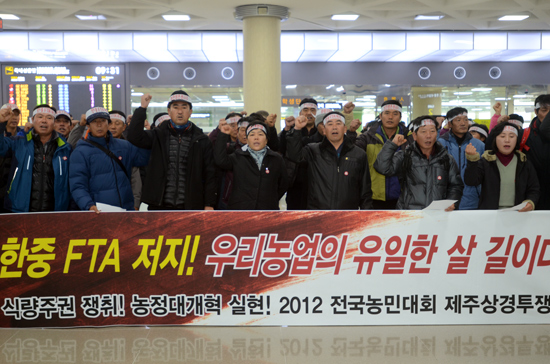 제주상경투쟁단은 27일 오전 제주국제공항 국내선 출발 대합실에서 기자회견을 갖고 “최악의 상황에 이른 나라의 식량주권을 지켜내어 우리 농업을 수호할 새로운 정부를 세울 수 있느냐”며 “300만 농민은 한미, 한중FTA에 대한 각 정당과 후보들의 입장을 주시하고 있다”고 밝혔다.