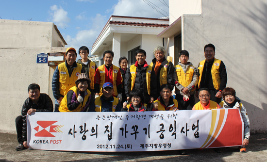 제주지방우정청은 지난 24일과 25일 지역밀착 공익사업의 일환으로 대정읍에 있는 중증장애인 두 가정을 찾아 주거환경 개선을 위한 ‘사랑의 집 가꾸기’ 공익사업을 펼쳤다.