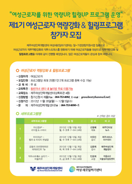 접수는 제주시 상록회관4층에 위치한 제주여성인력개발센터로 방문접수하거나 팩스(064-753-8092)나 이메일(grossbrot@hanmail.net) 접수도 가능하다. 참가비는 무료다.