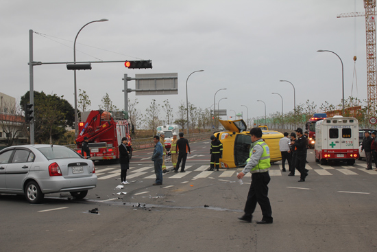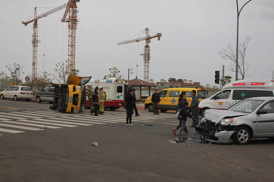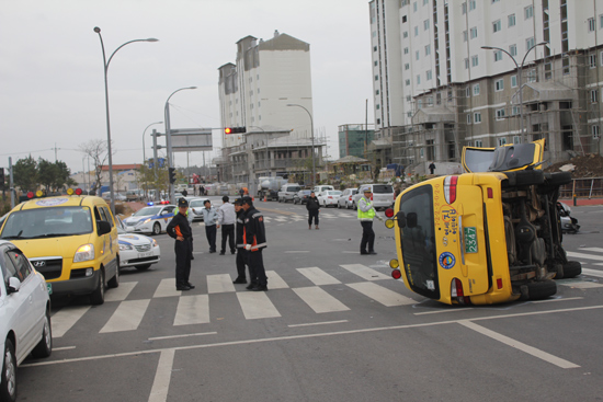 29일 오전 8시4분쯤 제주시 도련동 홍익아동복지센터 사거리에서 어린이집 차량과 베르나 승용차가 충돌해 어린이집 차량이 옆으로 넘어졌다.