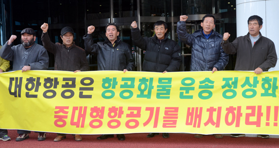 이에 분노한 채소재배 농민들과 농민단체는 4일 오전 대한항공 제주지사 앞에서 기자회견을 갖고 중대형항공기 즉각 배치를 촉구했다.
