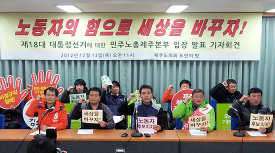 민노총 제주본부는 13일 오전 도의회 도민의 방에서 기자회견을 열고 “새누리당은 철저하게 자본과 권력의 이익만을 대변해온 정치모리배 집단에 불과하다”며 “민주통합당도 집권 10년 동안 정작 남은 것은 신자유주의 정책 강화로 인한 노동자 민중들의 고통스런 신음뿐”이라고 거대 여·야를 싸잡아 비난했다.