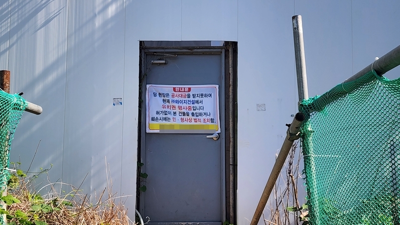외도동 390억원 규모의 삼부토건 공동주택 신축공사 현장도 공정률 50%를 넘겼지만 현재 공사가 멈춘 상태다. 현장 입구는 굳게 닫혀 있고, 컨테이너에는 '유치권 행사 중'이라는 경고문이 붙어 있었다.
