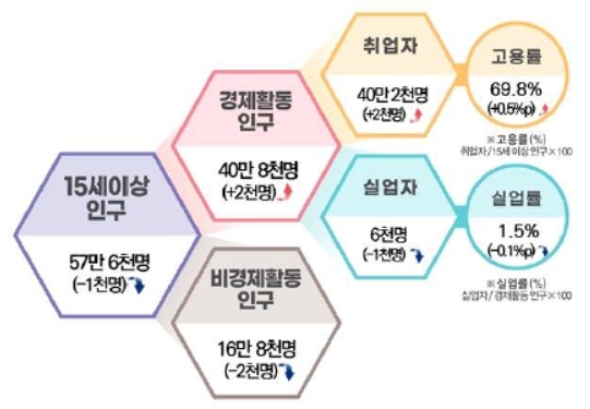 경제활동참가율은 70.8%로 지난해보다 0.3%포인트 상승했다. 여성 참가율은 67.7%로 2.6%포인트 증가한 반면 남성은 74.0%로 1.9%포인트 감소했다. 비경제활동인구는 16만8000명으로 2000명(-1.2%) 줄었다. 이 중 '육아'를 이유로 경제활동을 하지 않은 인구는 30.8%(8000명) 감소했다.