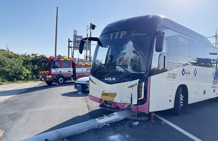 제주도소방안전본부에 따르면 24일 오전 8시 52분께 제주 서귀포시 안덕면 서광리 한 교차로에서 수학여행단을 태운 관광버스가 운행 중 도로 이정표를 들이받았다.