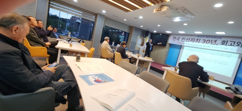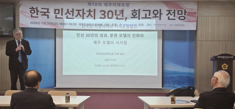 기조강연자로 나선 박재욱 신라대 교수(전 한국지방정치학회·한국지방정부학회 회장)는 ‘민선 30년의 성과와 분권모델의 진화, 제주모델의 시사점’을 의제로 제시했다.