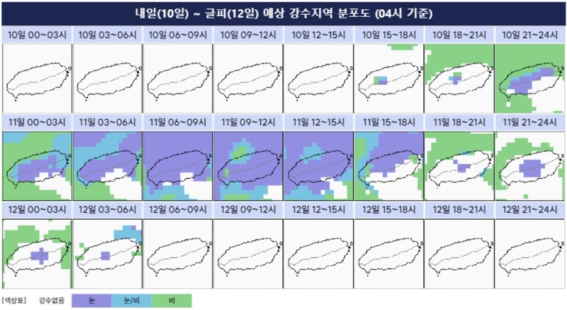 9일 제주지방기상청에 따르면 제주에는 토요일인 10일 늦은 오후부터 산지를 중심으로 비 또는 눈이 내리기 시작해 늦은 밤에 대부분 지역으로 확대되겠다.