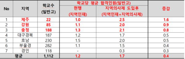 지역의사제 적용 지역 전체 일반고를 기준으로 하면 학교당 평균 0.6명이 의대 진학이 가능한 것으로 집계됐다.