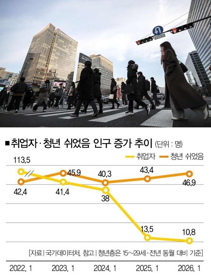 일도, 구직도 하지 않는 ‘쉬었음’ 인구는 278만명으로 1월 기준 역대 최대다. 특히 청년층은 46만9000명으로 지난해 1월 대비 8.1%(3만5000명) 증가했다. 그만큼 취업문을 두드리다 포기하는 청년이 많다는 의미다.