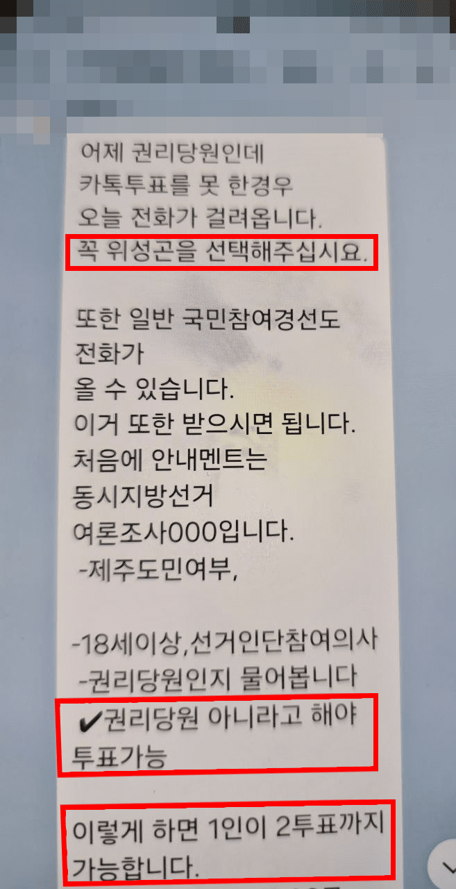 문 의원은 이날 ‘꼭 위성곤을 선택해주십쇼’라는 문구와 함께 “권리당원이 아니라고 하면 1인 2투표가 가능하다”는 취지의 카카오톡 메시지 내용을 공개했다.