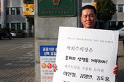 ▲ 27일 제주경실련 회원이 제주도의회 앞에서 한국공항의 지하 수 증산 동의안을 가결시킨 제주도의회 환경도시위원회 의원들 의 비난하고 박희수 제주도의회 의장에게 상정을 거부할 것을 촉 구하는 1인 시위를 하고 있다. 제주경제정의실천시민연합이 제주도의회 환경도시위원회 소속 하민철, 김명만, 김도웅, 김승하, 김진덕, 신관홍 의원 등 6명 의원들의 즉각 사퇴를 촉구했다. 제주경실련은 27일 성명을 내고 “제주도의회 환경도시위원회 의원 6명이 3년간 이어져 온 한국공항(주) 지하수 증량 문제를 조건부 동의로 처리했다”며 이같이 밝혔다. 제주도의회 환도위는 지난 26일 한국공항(주)의 지하수 취수량 1일 100톤(월 3000톤)의 증량안을 1일 20톤(월 600톤)으로 축소 수정해 처리했다. 또 일반판매는 금지하고 인터넷 판매는 총량의 4% 범위 내에서 제한하는 것으로 동의한바 있다. 제주경실련은 “도의회가 결국 지하수의 사유화를 인정함과 동시에 더욱 확실하게 인터넷 판매 허용까지 동의해준 결과를 낳았다”며 “4% 내의 인터넷 판매 제한은 아무런 법적 구속력이 없을 뿐만 아니라 자유경제시장 질서에도 위배되는 무