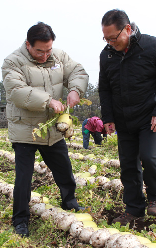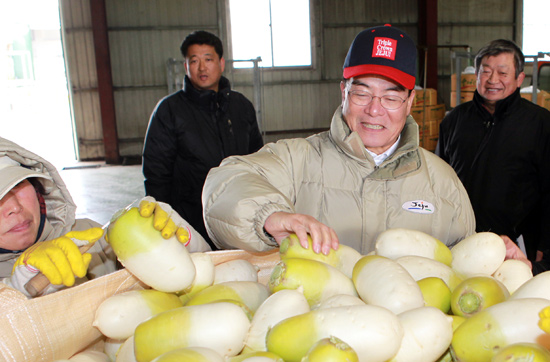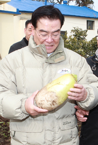 우근민 제주지사는 15일 서귀포시 성산읍지역 월동 무 생산현장과 유통센터 등을 찾아 농민들을 격려하고 농업정책에 대한 자신의 방향을 설명했다.