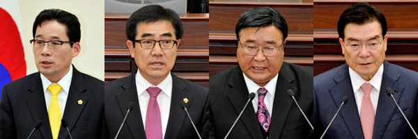 18일 오후 제주도의회에서 제303회 임시회 개회식 현장. 이날 개회식에서 박희수 도의회 의장과 박원철 민주통합당 원내대표, 구성지 새누리당 원내대표는 모두 ‘행복’과 ‘민생(경제 활성화)’을 강조했다.