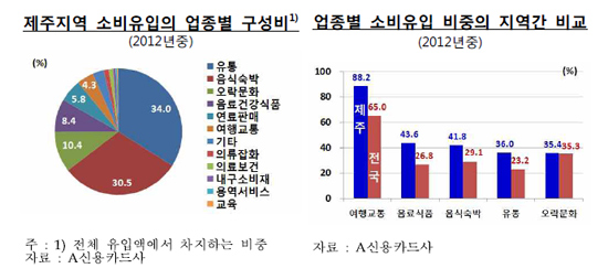 제주도민의 도내 신용카드 사용액 중 가장 높은 것은 유통(22.1%)로 가장 높았다. 이어 연료(21.3%), 음식·숙박(15.6%), 오락·문화(6.9%), 의료보건(6.7%) 등이다. 전국 평균과 비교했을 때 의료·보건, 유통 등의 비중이 낮은 반면 음식·숙박, 오락·문화 등의 비중은 높았다.