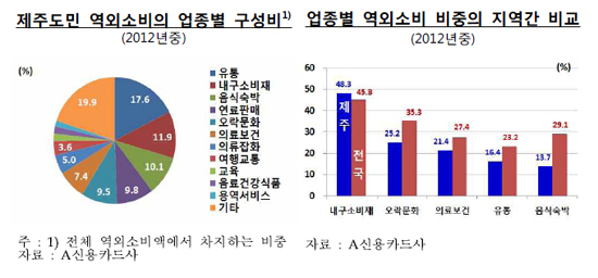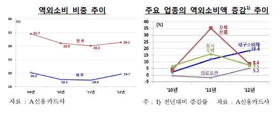 제주도민이 다른 지역에서 사용한 카드사용액(역외소비)는 19.7%이다. 전국에서 가장 낮다. 제주도민의 역외소비는 2009년 20.2%에서 2011년까지 18.0%로 감소 추세였다. 그러나 지난해에는 오름세로 전환했다.