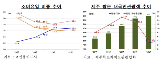 제주지역의 신용카드 사용액 소비유입 비중은 2009년 22.4%에서 2011년 26.5%로 상승했지만 지난해에 다소 둔화됐다. 이는 최근 내국인 관광객의 증가율이 크게 낮아진데 따른 것으로 보인다. 실제로 지난해 1/4분기 관광객 증가율은 18.6%였지만 3/4분기 5.6%, 4/4분기 6.3%에 그쳤다. 올해 1월에는 오히려 –2.5%를 기록했다. 다행히 지난달에는 2.0%로 상승세로 전환했다.
