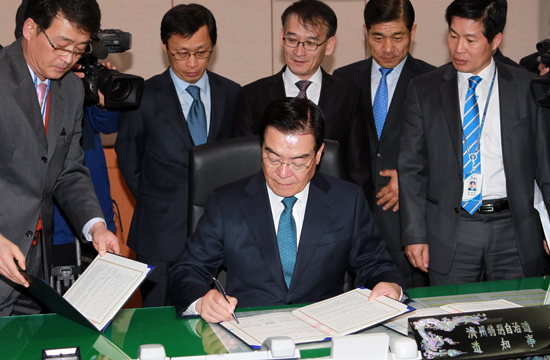 14일 오전 우 지사는 지사 집무실에서 국무총리실 임석규 제주도정책관, 박찬석 해군본부 전략부장, 박승기 국토해양부 항만정책관 등이 참석한 가운데 국방부장관과 국토해양부장관이 서명한 민군복합형 관광미항 공동사용 협정서에 서명했다.